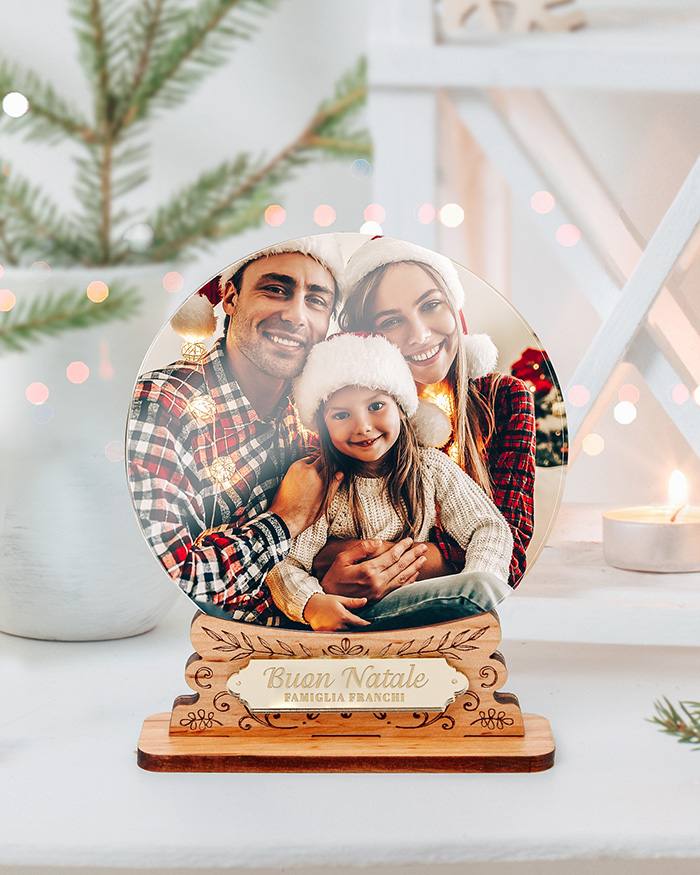 Splendido Portafoto a forma di Palla di Neve Personalizzato con Nome e Foto, perfetto per festeggiare il Natale in famiglia. La ricchezza dei materiali unita all’ottima fattura ti assicura la certezza di un oggetto davvero unico nel suo genere, da esibire con orgoglio in salotto in occasione delle feste di Natale.