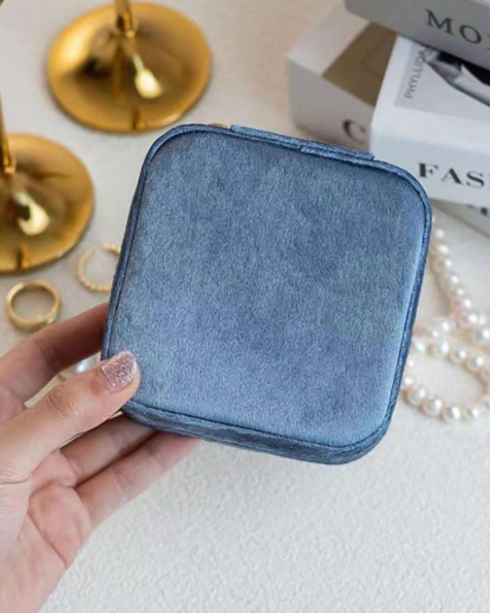 Questa scatolina portagioie in velluto blu combina eleganza e funzionalità in un formato pratico e compatto. Le sue dimensioni di 10×10 cm con un’altezza di 5 cm la rendono perfetta per organizzare i tuoi gioielli in modo ordinato e sicuro, sia a casa che in viaggio.