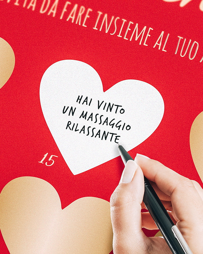 Il poster viene fornito già montato nel suo porta poster di larghezza 44 cm, adatto al formato del poster 40×65 cm. Le 24 caselle, una per giorno, sono vuote: potrai scrivere tu con la penna le attività che desideri fare insieme alla tua dolce metà. Una volta scritte tutte le attività, non dovrai far altro che incollare i cuoricini gratta e vinci forniti sopra i cuori e avrai il tuo calendario sorpresa!