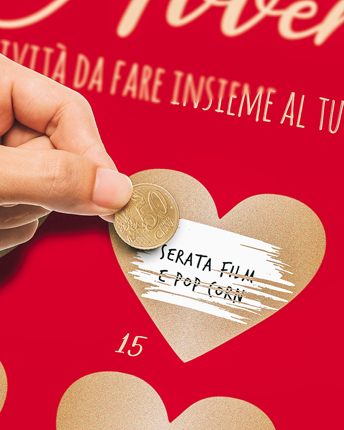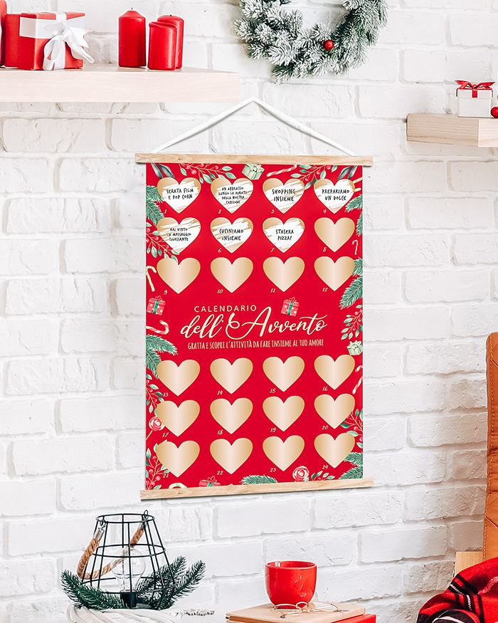 Aggiungi un tocco di brio al tuo prossimo dicembre con questo carinissimo calendario dell’avvento personalizzabile. Scrivi un’attività per ogni giorno dall’1 al 24 dicembre e stupisci il tuo ragazzo o la tua ragazza con effetti speciali! Ogni giorno lui o lei potrà grattare un cuoricino e vedere che attività hai pensato da fare insieme. Sarà un modo alternativo e originale per passare del tempo insieme in attesa del Natale.