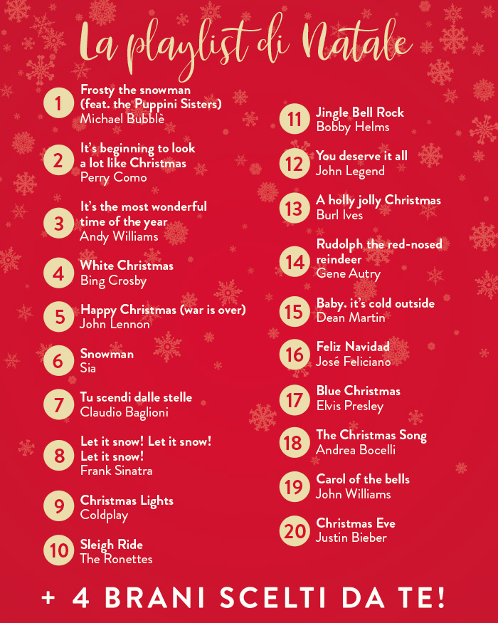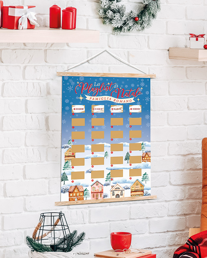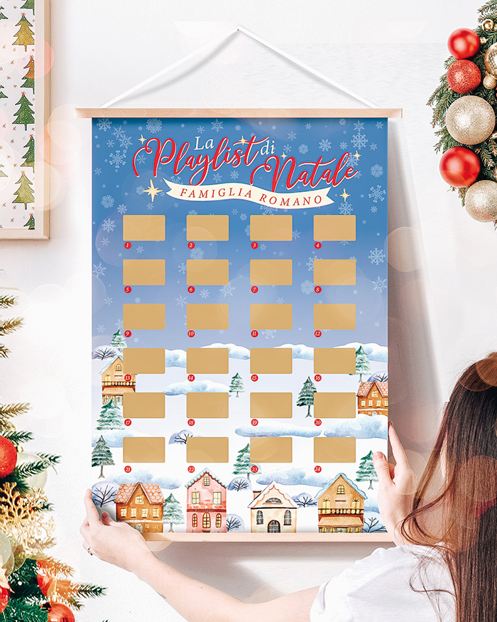 Non può mancare un calendario musicale il prossimo Natale: divertiti con questo calendario dell’avvento gratta e vinci a tema Playlist natalizia! Ogni giorno potrai grattare una casella e scoprire che canzone natalizia abbiamo pensato per te: non dovrai far altro che inquadrare il codice Spotify con l’app Spotify del tuo smartphone e la canzone designata risuonerà in tutta la casa. Le prime 20 canzoni sono già fornite (trovi la playlist in galleria), mentre le ultime 4 puoi personalizzarle tu: ti basta compilare i campi richiesti inserendo titolo e autore della canzone. Sarà un modo originale e alternativo per attendere il Natale con un tocco di allegria in più.