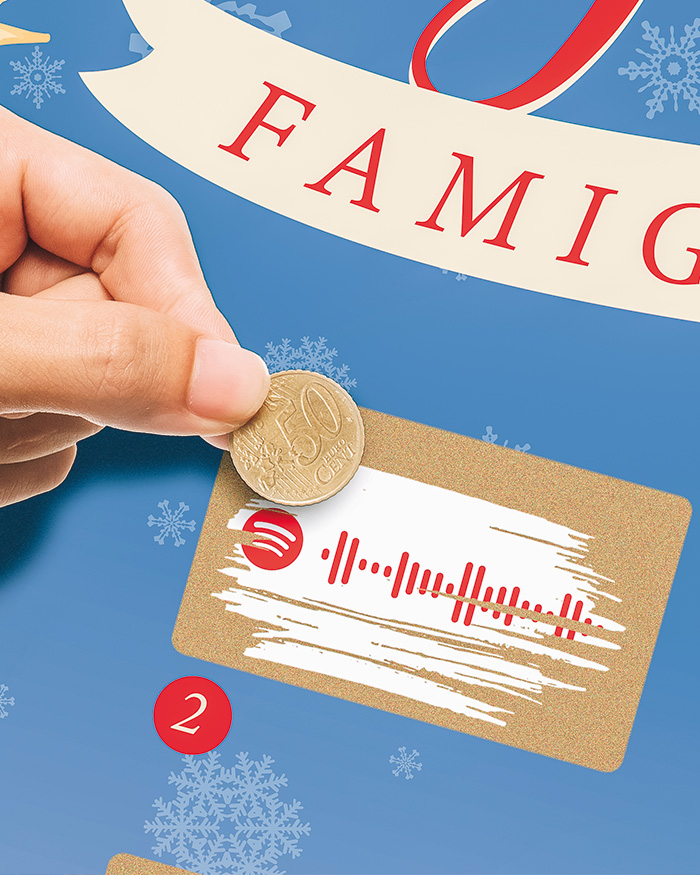 Originalissimo Calendario dell’Avvento Gratta e Vinci Personalizzabile con la Playlist di Natale in formato codici Spotify! Divertiti ad attendere il Natale grattando ogni giorno una casella e inquadrando il codice Spotify corrispondente con il tuo smartphone: dall’app Spotify del tuo cellulare partirà una meravigliosa canzone di Natale! Le prime 20 canzoni te le forniamo noi, le ultime 4 puoi personalizzarle tu. Perfetto come regalo per tutti coloro che sono già in modalità “Natale” e non vedono l’ora di ascoltare i più grandi successi natalizi.