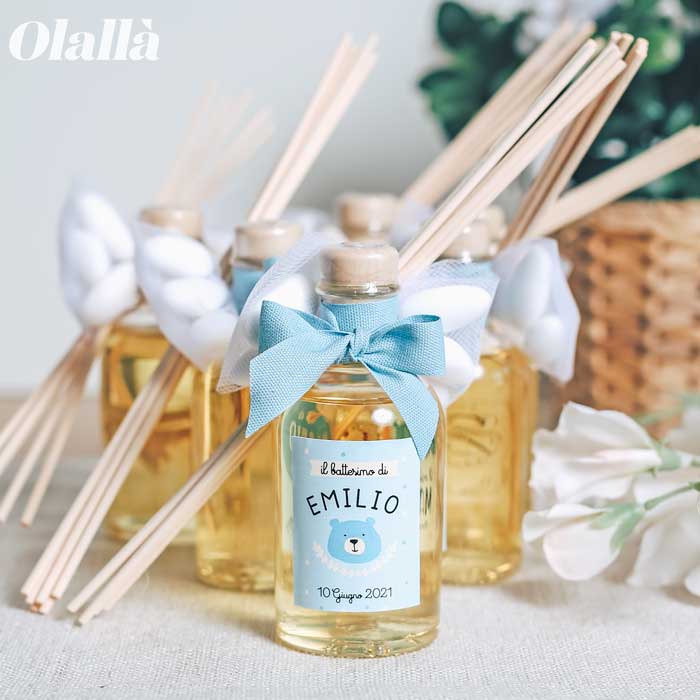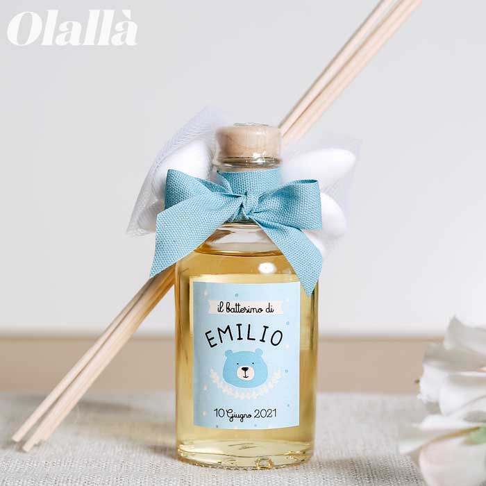 Originale Profumatore per Ambiente completamente Made in Italy, idea per Bomboniera Battesimo, con etichetta personalizzata a tema Orsetto. 3 diverse fragranze per conferire ai vostri eventi importanti un profumo unico. Tutte le fragranze sono prodotti italiani di alta qualità, e a differenza delle profumazioni industriali che si volatilizzano velocemente, queste persistono a lungo nell’ambiente. Ogni bomboniera è confezionata artigianalmente a mano.