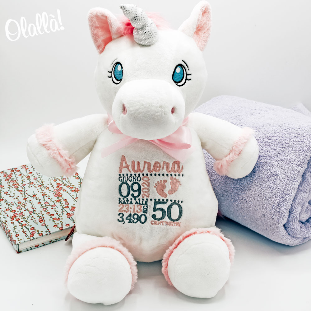 Morbidissimo peluche unicorno personalizzato con il nome del neonato e tutti i dati della nascita come peso, altezza, data e orario di nascita. Realizzate un regalo davvero originale per un bambino o bambina davvero speciale! Stupite i genitori e lasciate che il piccolo si ricordi sempre di voi ogni volta che stringerà a sé questo meraviglioso pupazzo personalizzato.