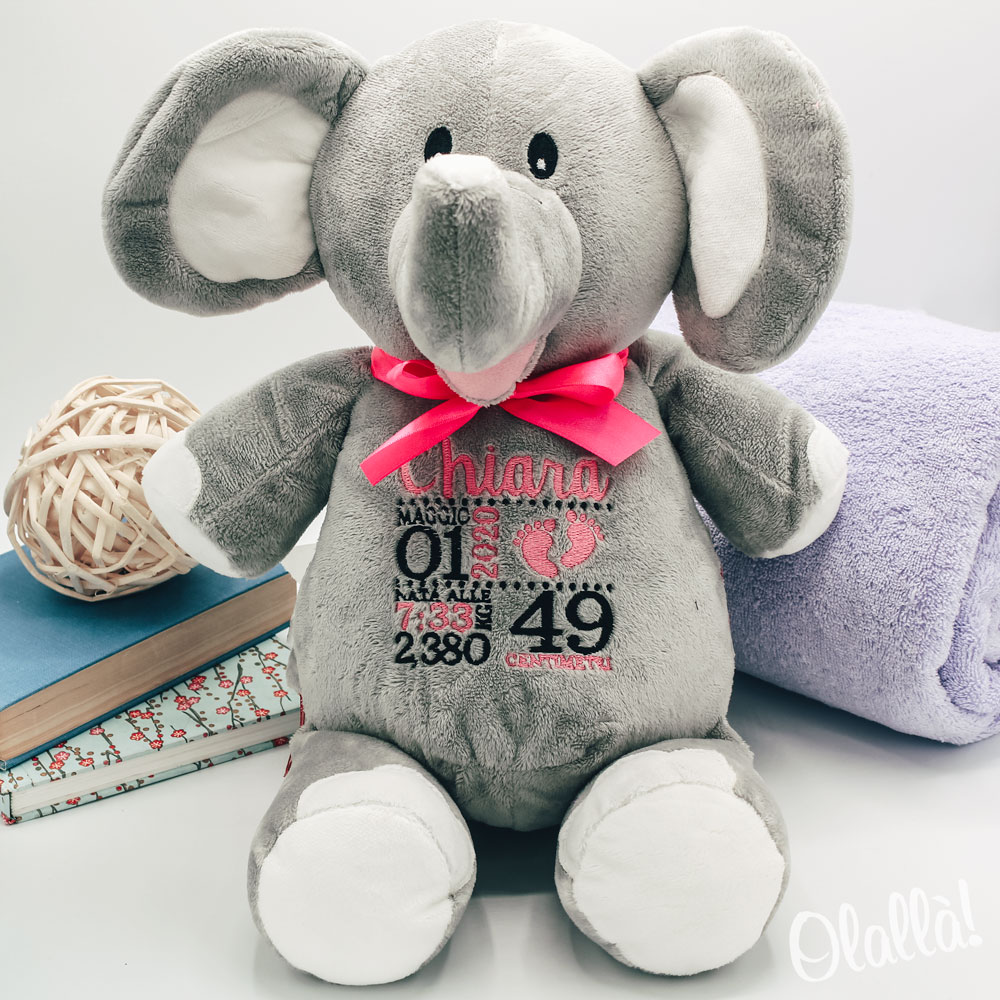 Se proprio devo trovare un neo, essendo l’elefantino tutto grigio, diversamente da altri peluche che hanno la pancia bianca, avrei fatto il ricamo con un filo di un tono più scuro, per far risaltare di più le scritte.