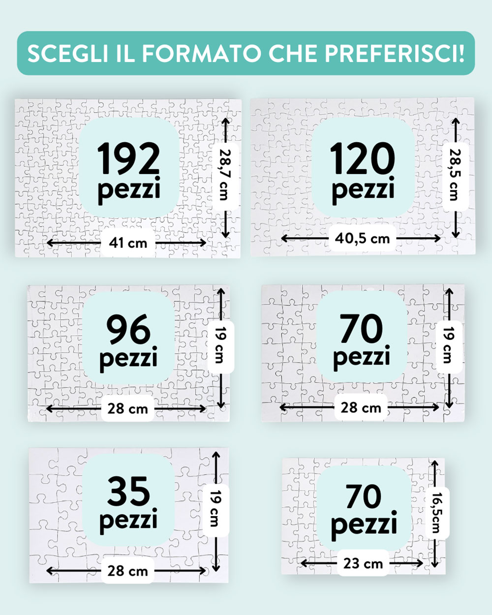 Puzzle personalizzato con foto, dedica e scatola coordinata disponibile in sei diversi formati.