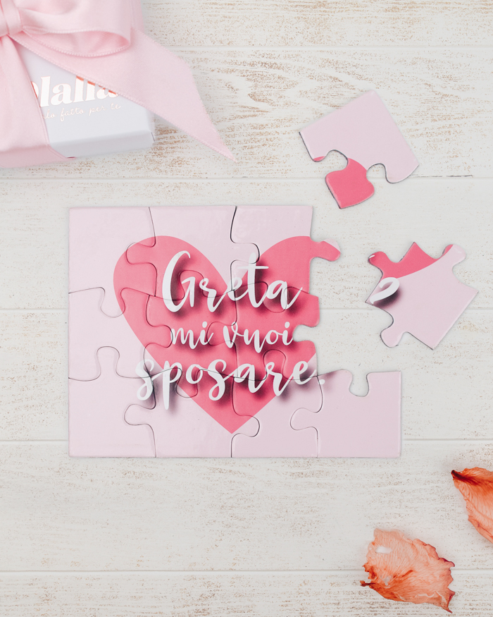 Romantico puzzle a sorpresa per chiedere alla donna della tua vita di diventare tua moglie. La tua futura sposa, una volta aperta la scatolina che contiene le tessere personalizzate, si divertirà a comporre il puzzle trepidante fino a che la frase non risulterà composta e leggibile. L’effetto sorpresa è assicurato, come siamo sicuri, anche la risposta!