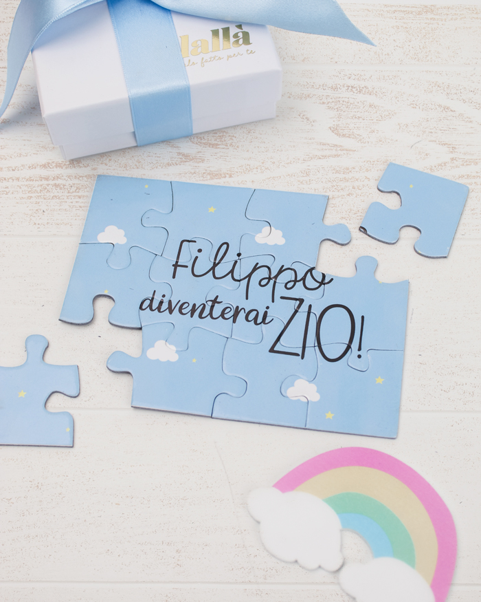 Dolcissimo puzzle a sorpresa per annunciare a fratelli e sorelle la nascita del nipotino o nipotina. I futuri zii, una volta aperta la scatolina che contiene le tessere personalizzate, si divertiranno a comporre il puzzle fino a che la frase non risulterà composta e leggibile. L’effetto sorpresa è assicurato, come anche le lacrime di gioia che seguiranno!