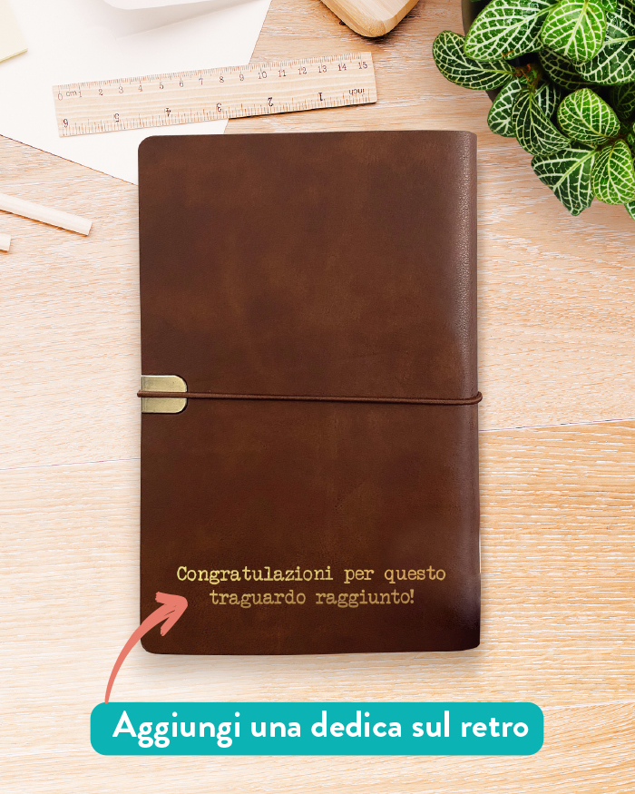 Scegli questo Quaderno Taccuino Agenda Vintage in Ecopelle con Anelli Personalizzato come regalo per festeggiare la laurea. Oltre ad essere uno strumento elegante e funzionale, rappresenterà un simbolo tangibile del suo successo, celebrando il suo lavoro e la sua dedizione.