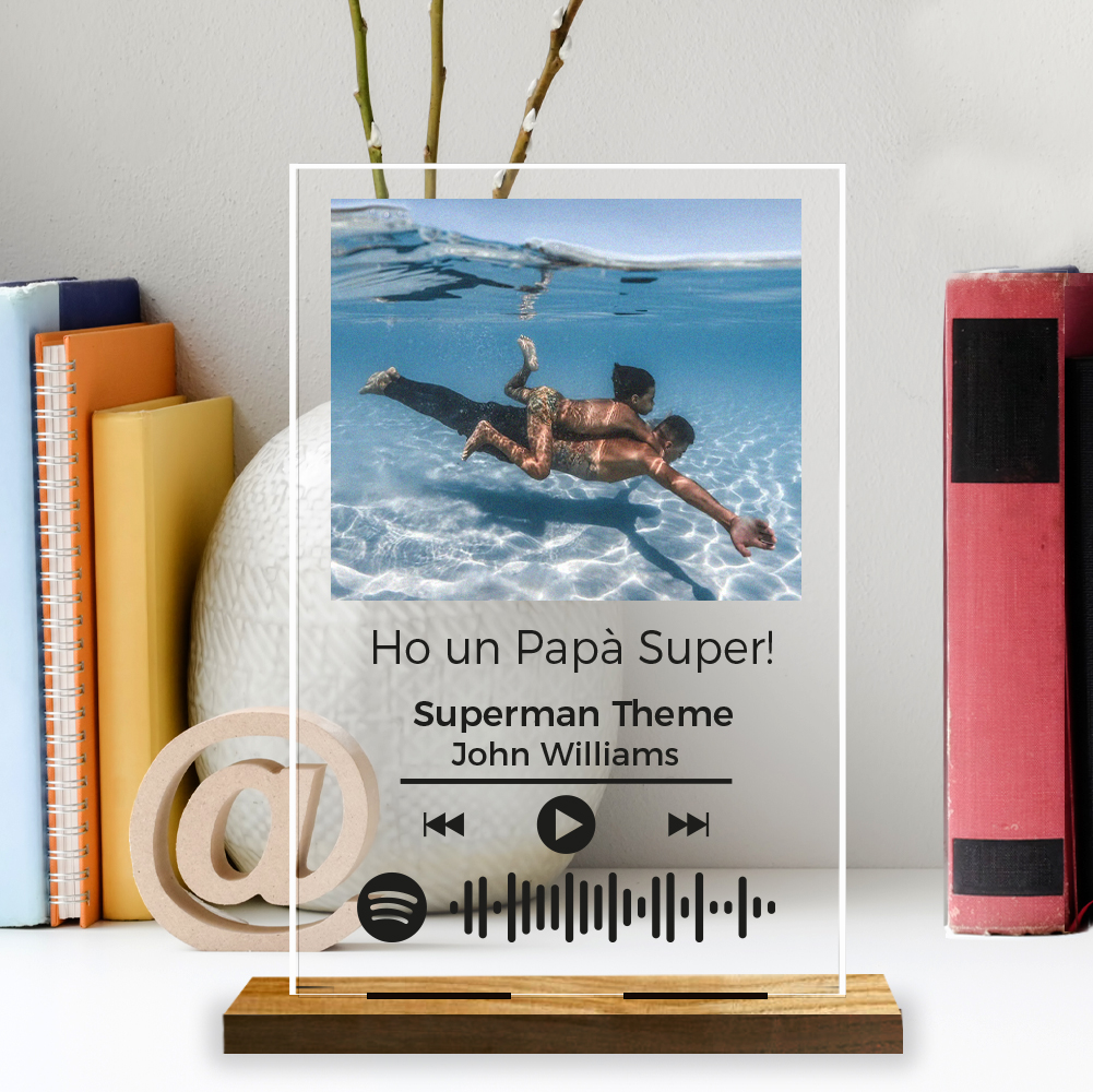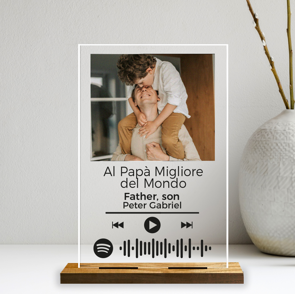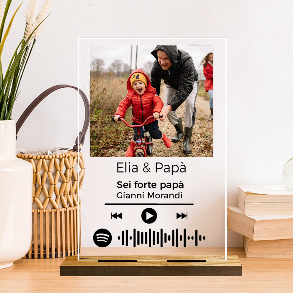 Bellissima Targhetta in plexiglass trasparente personalizzabile con la vostra foto, i nomi e il codice Spotify della vostra canzone. Regala un’emozione unica al tuo papà e stupiscilo nel giorno della sua festa.