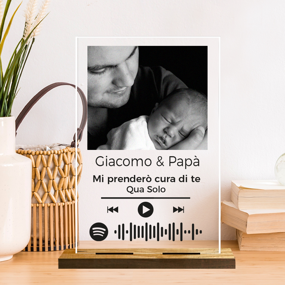 Originale Quadretto o Placca in Plexiglass Personalizzabile con la vostra foto, i nomi o una brevissima dedica e il codice Spotify della vostra canzone del cuore. Quale occasione migliore della Festa del Papà per dire al tuo babbo quanto gli vuoi bene e quanto è importante per te?