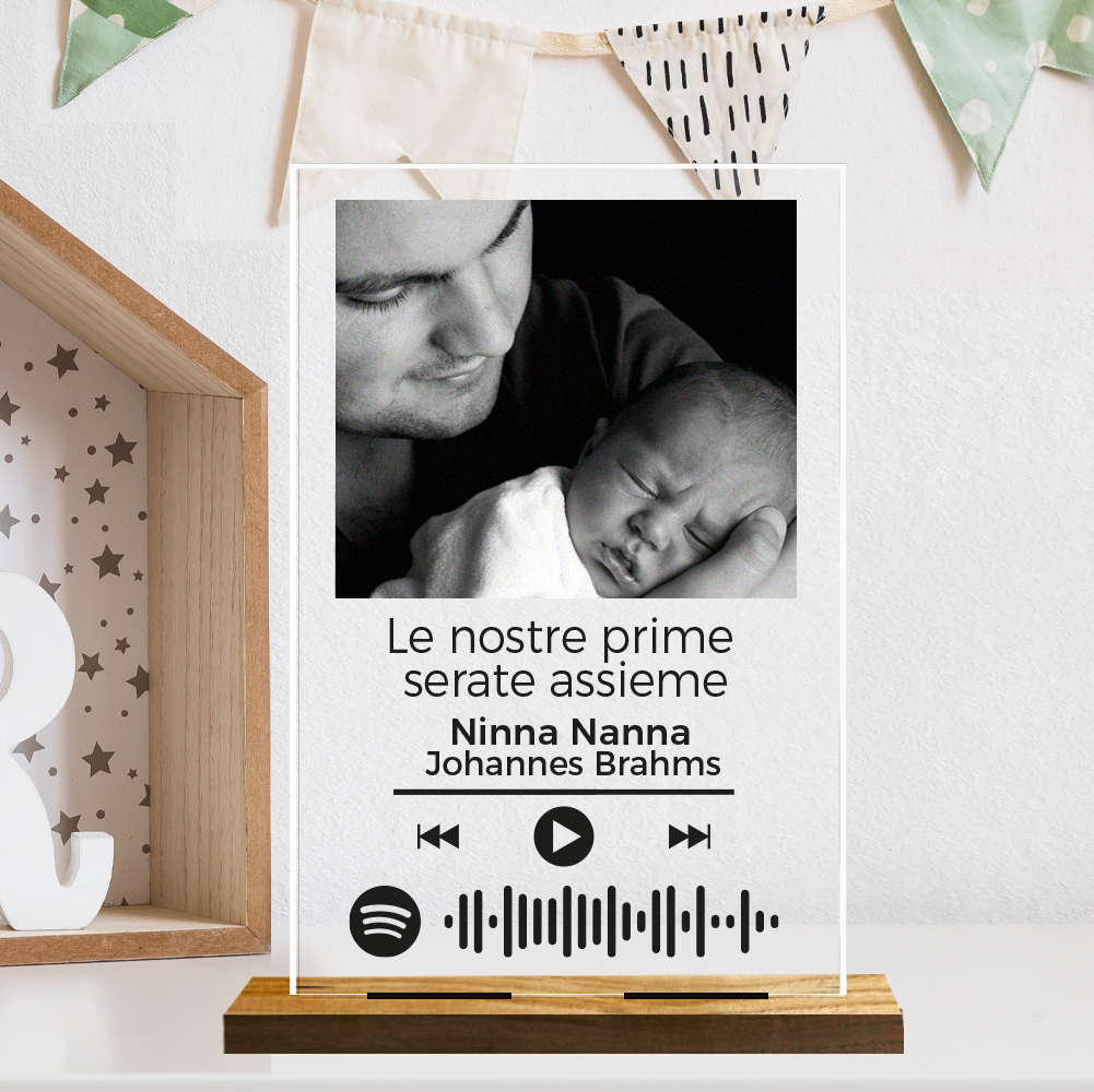 Con questa targhetta potrai far stampare la foto più bella del papà con i suoi bimbi direttamente sul plexiglass trasparente, aggiungere i loro nomi o una dolce dedica e la canzone per loro più rappresentativa! E perché no, anche una ninna nanna: al papà basterà inquadrare il codice Spotify per riprodurre la canzone preferita del suo bimbo e addormentarlo teneramente.