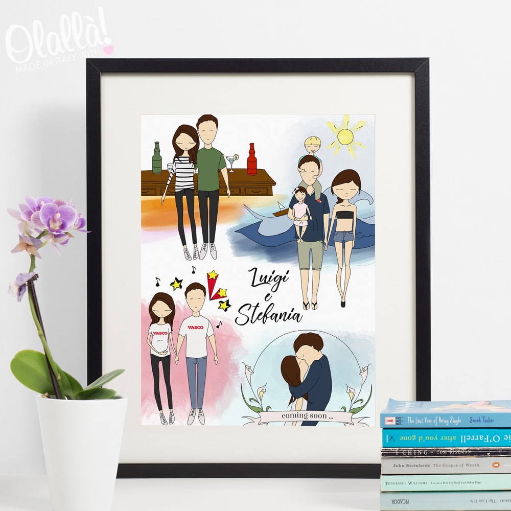 Questa simpatica illustrazione viene realizzata a mano in digitale da una bravissima e giovane designer italiana. Potete inserire quanti soggetti desiderate nel vostro ritratto, anche cani gatti o pesci rossi! L’illustratrice riprodurrà i soggetti nel modo in cui voi le indicherete quindi date pure tutti i dettagli che ritenete siano importanti (ad esempio, “Nonna Maria ha un po’ di capelli bianchi, ma di base è bruna, è una signora sportiva e atletica dal fisico asciutto, veste sempre tinte pastello”, oppure “Oliver è un cucciolo di Labrador dal color Miele”, “Ritrarre Nonno Mario mentre stringe per mano il nipotino Giovanni”…). Per agevolare l’illustratrice potete anche fornire delle foto che ritraggono i vostri soggetti. Se avete più immagini potete anche inviarle via email al nostro servizio clienti una volta realizzato l’ordine. Una volta ricevuto l’ordine, l’illustratrice vi invierà una bozza in bianco e nero del disegno via whatsapp o email e se tutto è come lo desiderate si procederà con la colorazione e la stampa. In alternativa, dovesse esserci qualche modifica la potrete richiedere in UN’UNICA VOLTA in modo da agevolare la realizzazione spedita dell’opera.