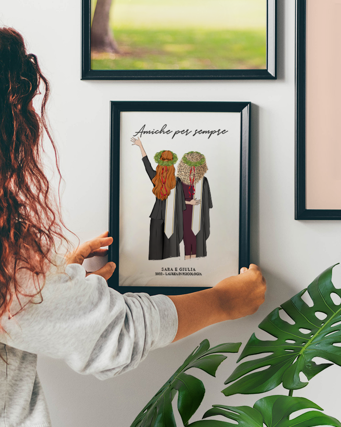 Incredibile Ritratto Personalizzato delle due Amiche Laureate, ritratte di spalle mentre festeggiano l’importante traguardo raggiunto. Ricorda questo momento magico vissuto con la tua migliore amica e compagna di studi grazie a questo spettacolare ritratto che puoi personalizzare nel look delle neo dottoresse e nelle scritte.