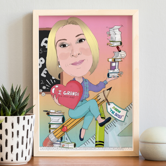 Simpaticissimo Ritratto Personalizzato in stile caricatura della Maestra. Carica la foto della tua insegnante e la nostra bravissima illustratrice lo trasformerà in questo fantastico ritratto! Affidati alla sua esperienza per creare un ritratto divertente e originale che lascerà il segno nel cuore della tua maestra del cuore!