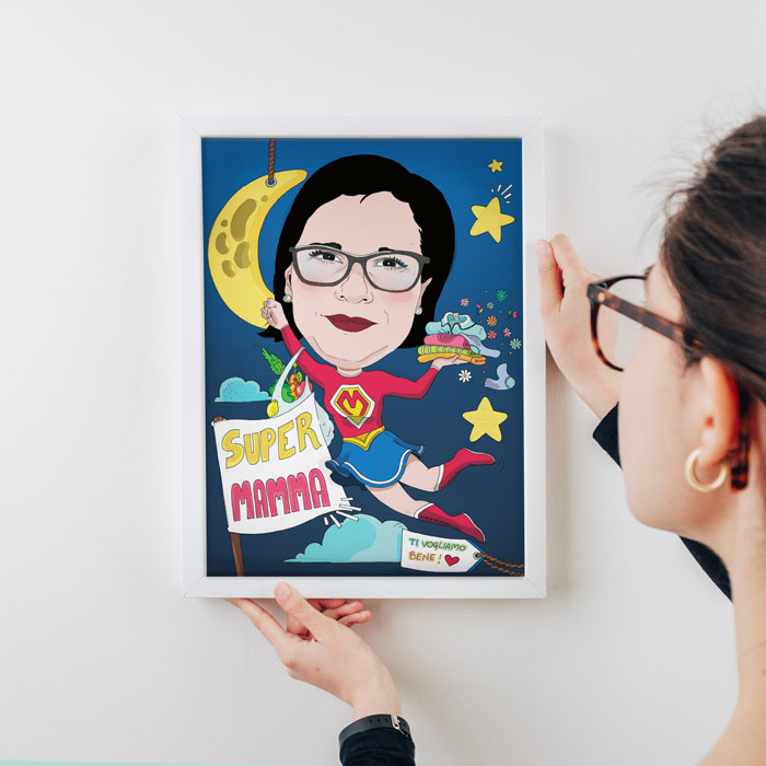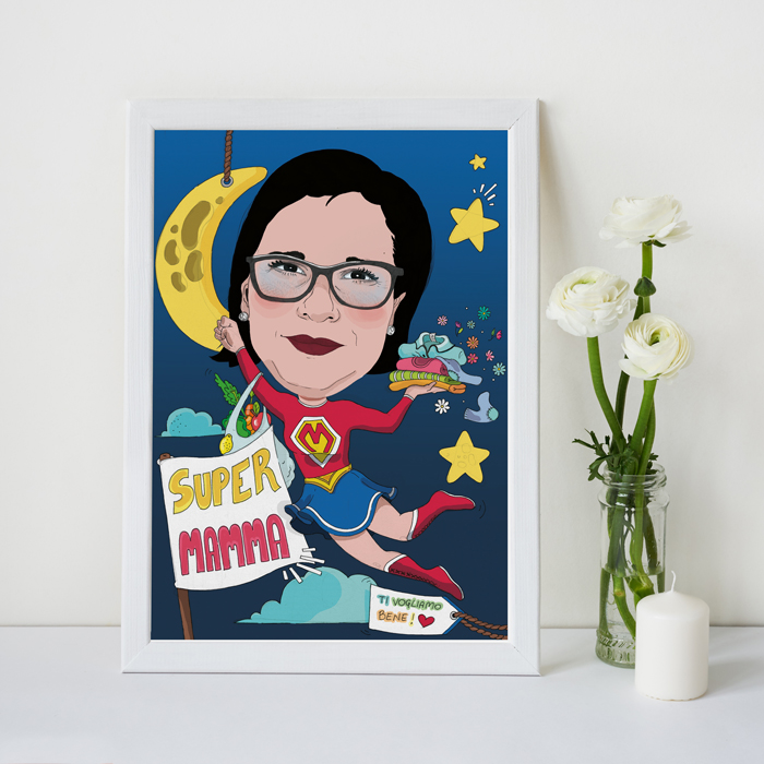 Simpaticissimo Ritratto Personalizzato in stile caricatura a tema “SuperMamma”. Carica la foto della tua mamma e la nostra bravissima illustratrice lo trasformerà in SuperMamma! Affidati alla sua esperienza per creare un ritratto divertente e originale che lascerà il segno nel cuore della tua mamma!