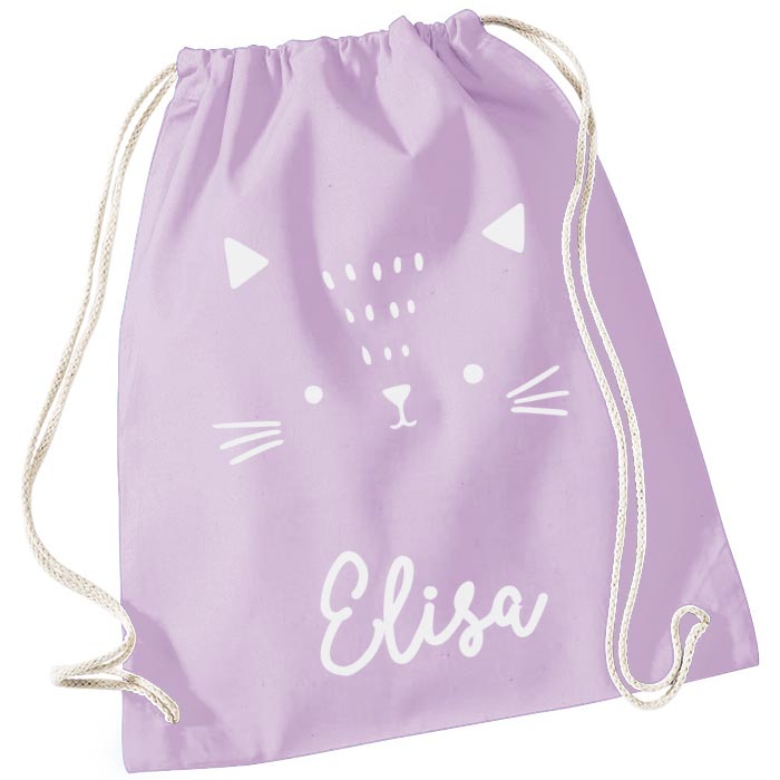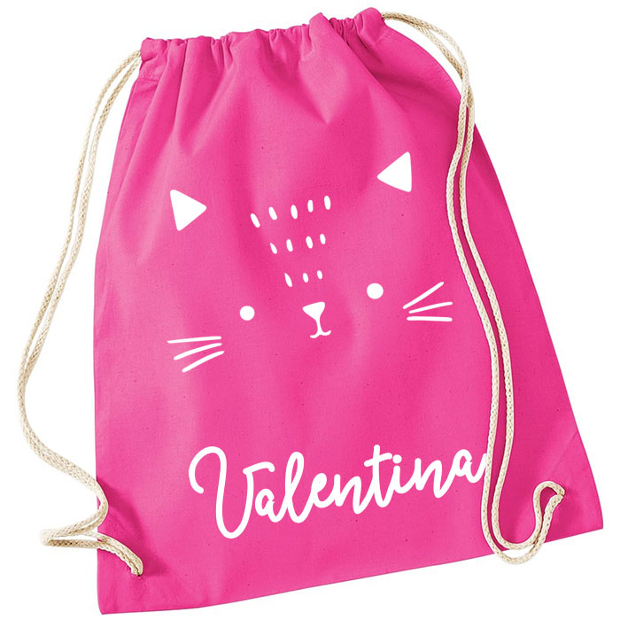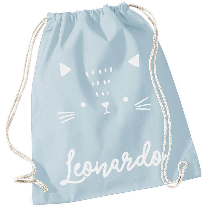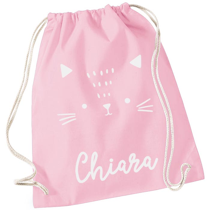 Semplice ma super utile sacca zainetto per la scuola personalizzata con il nome del bambino e la simpatica sagoma di un gattino. Realizza lo zainetto perfetto per la scuola materna, l’asilo nido o per lo sport, il corso di musica, il catechismo del tuo bambino…