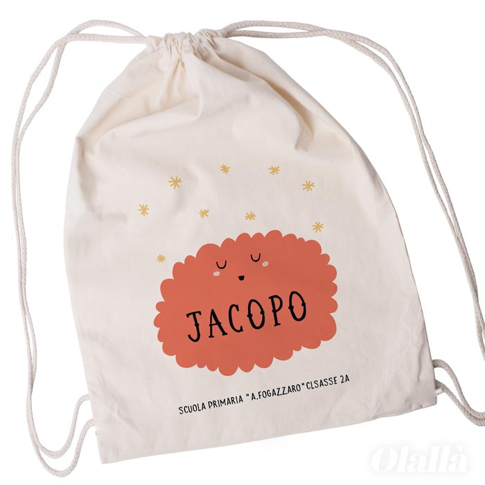 Semplice ma super utile sacca zainetto per la scuola personalizzata con il nome del bambino su simpatica nuvoletta arancione con stelline. Realizza lo zainetto perfetto per la scuola materna, l’asilo nido o per lo sport, il corso di musica, il catechismo del tuo bambino…