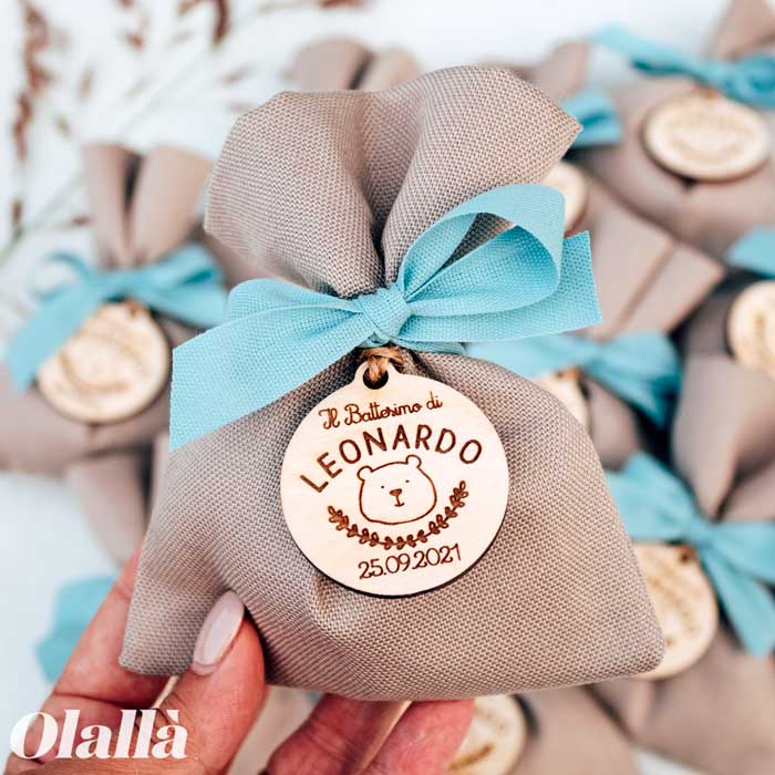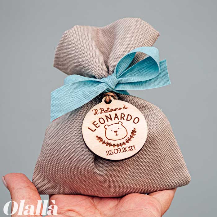 Sacchettino Porta Confetti Bomboniera con Etichetta Tonda in Legno con Orsetto