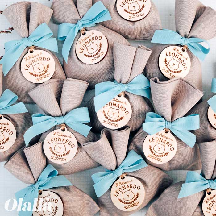 Delizioso sacchettino in cotone porta confetti con etichetta in legno personalizzata con le vostre frasi ed un simpatico orsetto. Ideale per realizzare una bomboniera di battesimo, comunione o cresima semplice ma elegante allo stesso tempo.