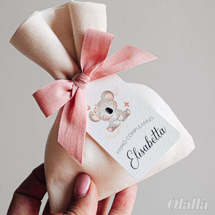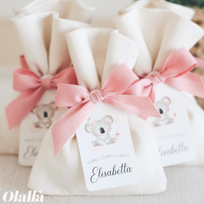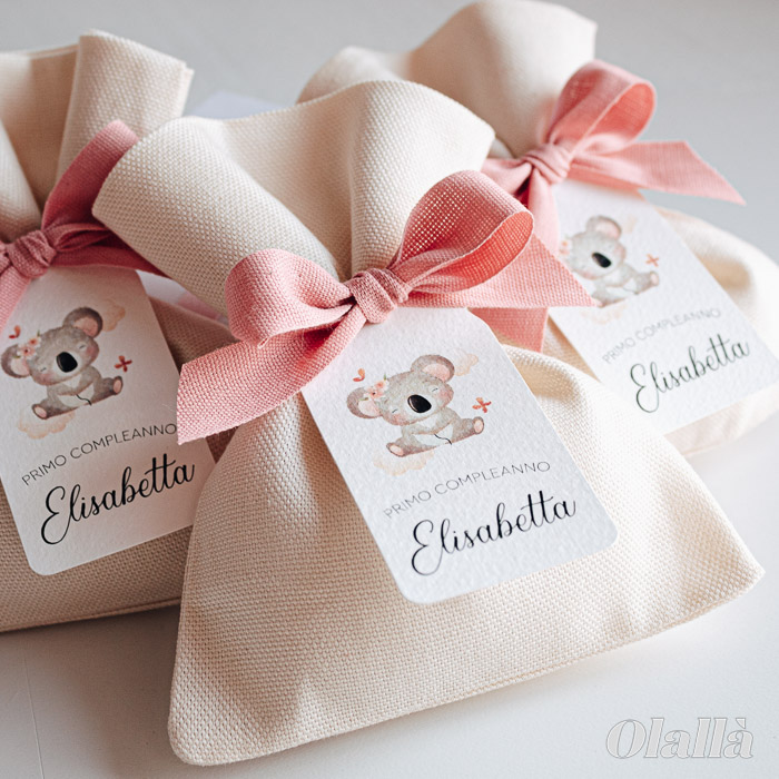 Delizioso sacchettino portaconfetti in cotone realizzato interamente in Italia con etichetta con dolce koala nome e data del vostro evento. Un ricordo dolce e simpatico del battesimo o del primo compleanno del tuo bambino da donare ad amici, parenti e tutte le persone che ami.