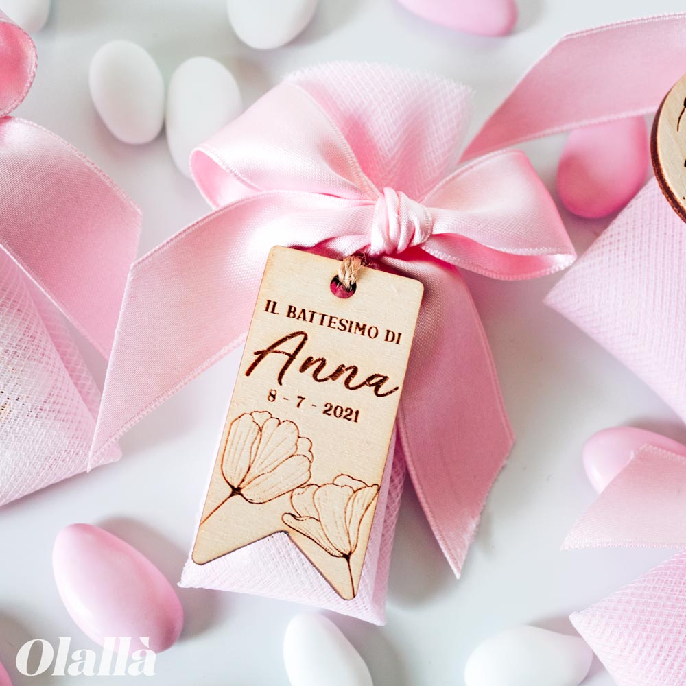 Delizioso sacchettino portaconfetti in tulle con tag in legno personalizzata con nome e data ed un decoro di tulipani. Un ricordo dolce e simpatico del battesimo del tuo bambino da donare ad amici, parenti e tutte le persone che ami.
