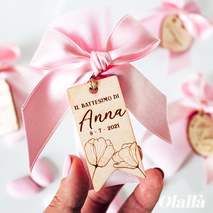 La tag in legno viene personalizzata con incisione e misura 5 x 3 cm.