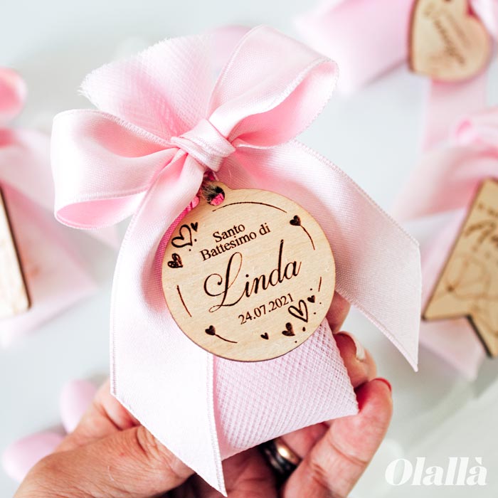 Delizioso sacchettino portaconfetti in tulle con tag in legno tonda con cuoricini personalizzata con nome e data. Un ricordo dolce e simpatico del battesimo del tuo bambino da donare ad amici, parenti e tutte le persone che ami.