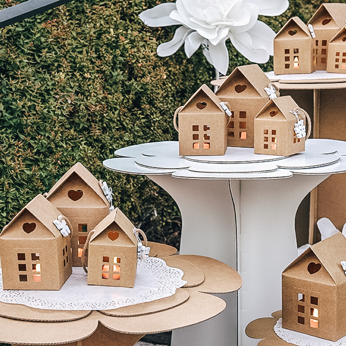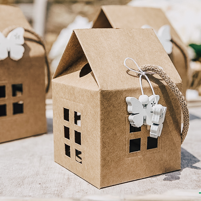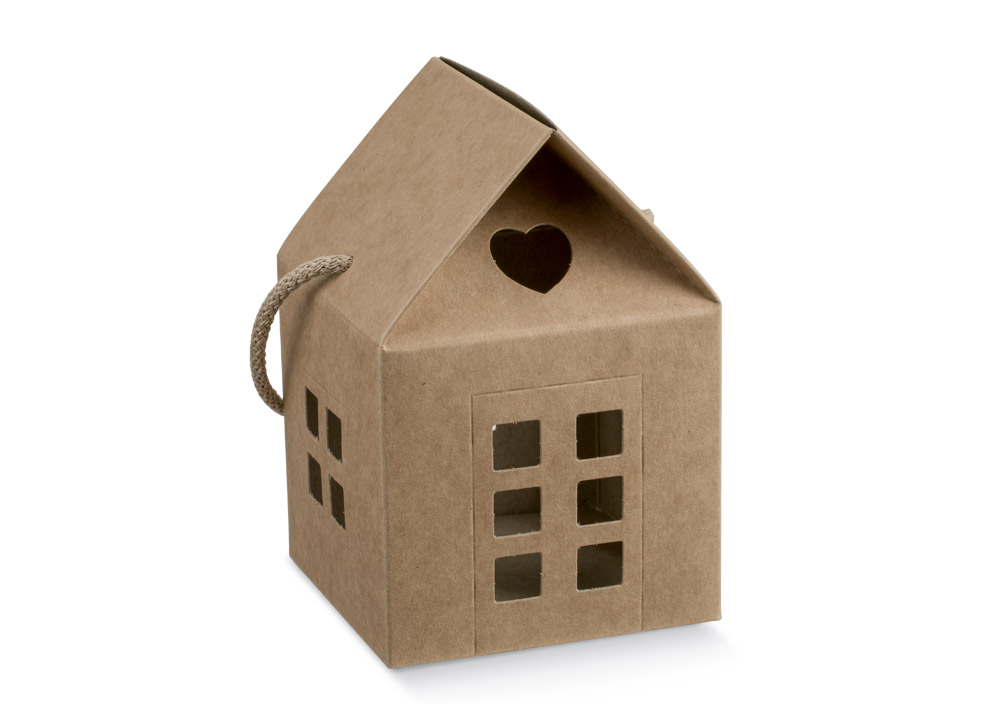 Splendido set di 10 scatole a forma di casetta con finestrelle forate in modo da lasciar intravedere l’interno. Realizzate in carta pregiato cartoncino color avana, sono perfette per realizzare bomboniere per il matrimonio, l’anniversario o per creare atmosfere suggestive, se illuminate dall’interno con dei punti luce led. Varie misure a disposizione, per tutte le tue esigenze. Disponibile sul sito anche in altri colori.