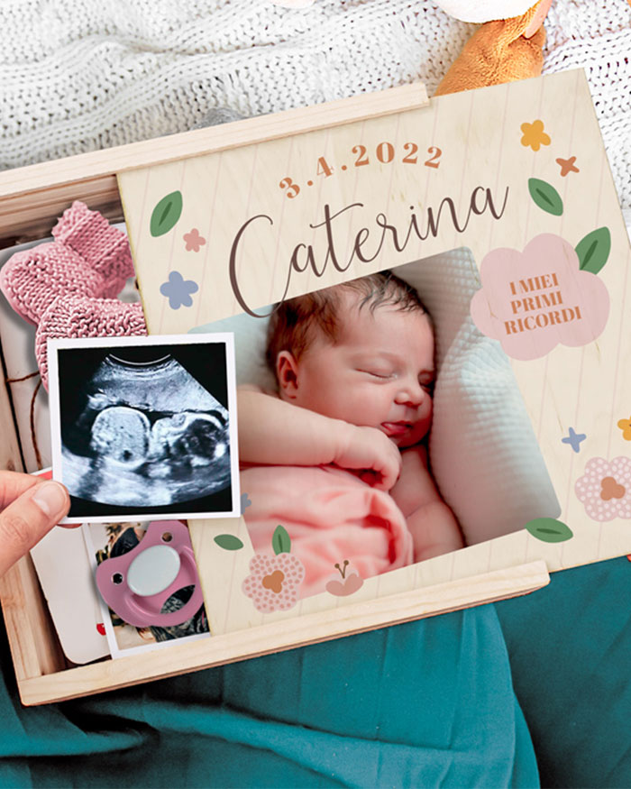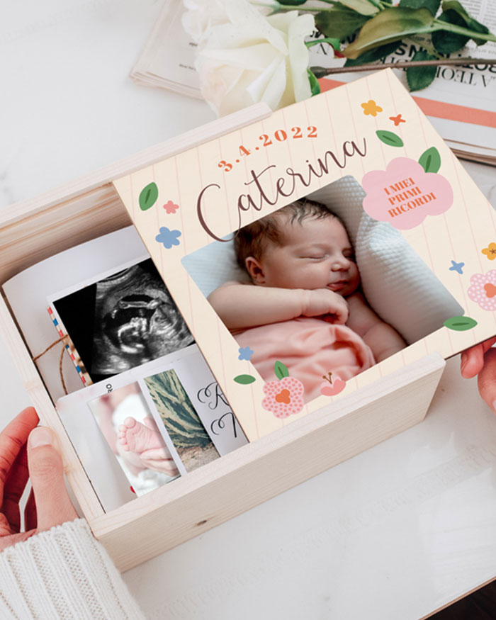 Bellissima scatola memory box per raccogliere tutti i migliori momenti della femminuccia appena arrivata. Raccogli i ricordi più belli legati alla gravidanza in questa stupenda scatola in legno, personalizzabile con una foto e una dedica sul coperchio. Puoi metterci dentro di tutto, le prime scarpine, la prima ecografia, le foto insieme appena arrivati a casa…Tutti questi ricordi potranno essere raccolti dentro questa “capsula del tempo” che i genitori possono comporre insieme per creare un ricordo indelebile della neo arrivata.