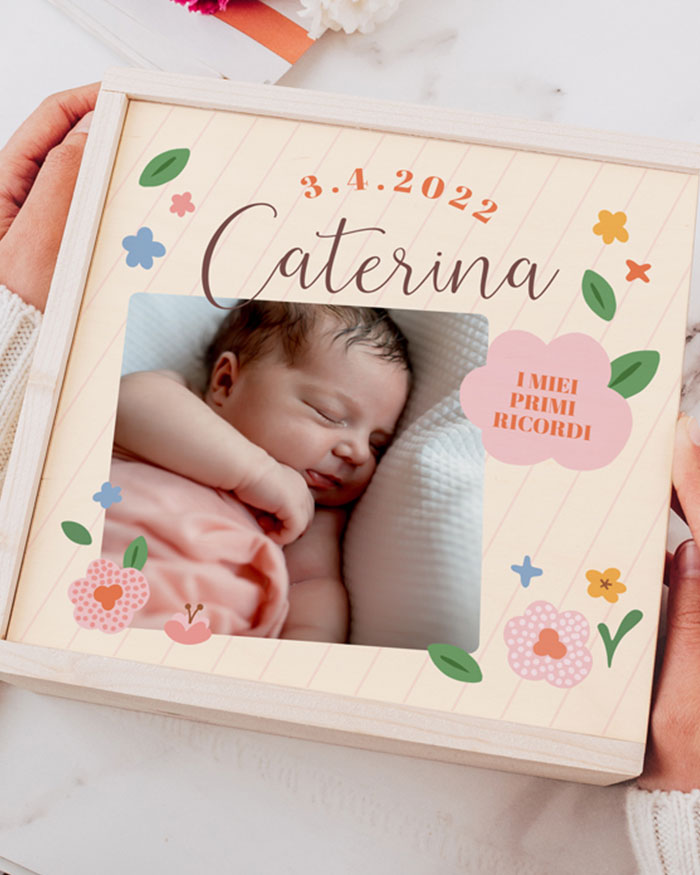 Il coperchio della scatola è personalizzabile con una foto e con il nome della neonata. È possibile inserire uno scomparto interno in legno.