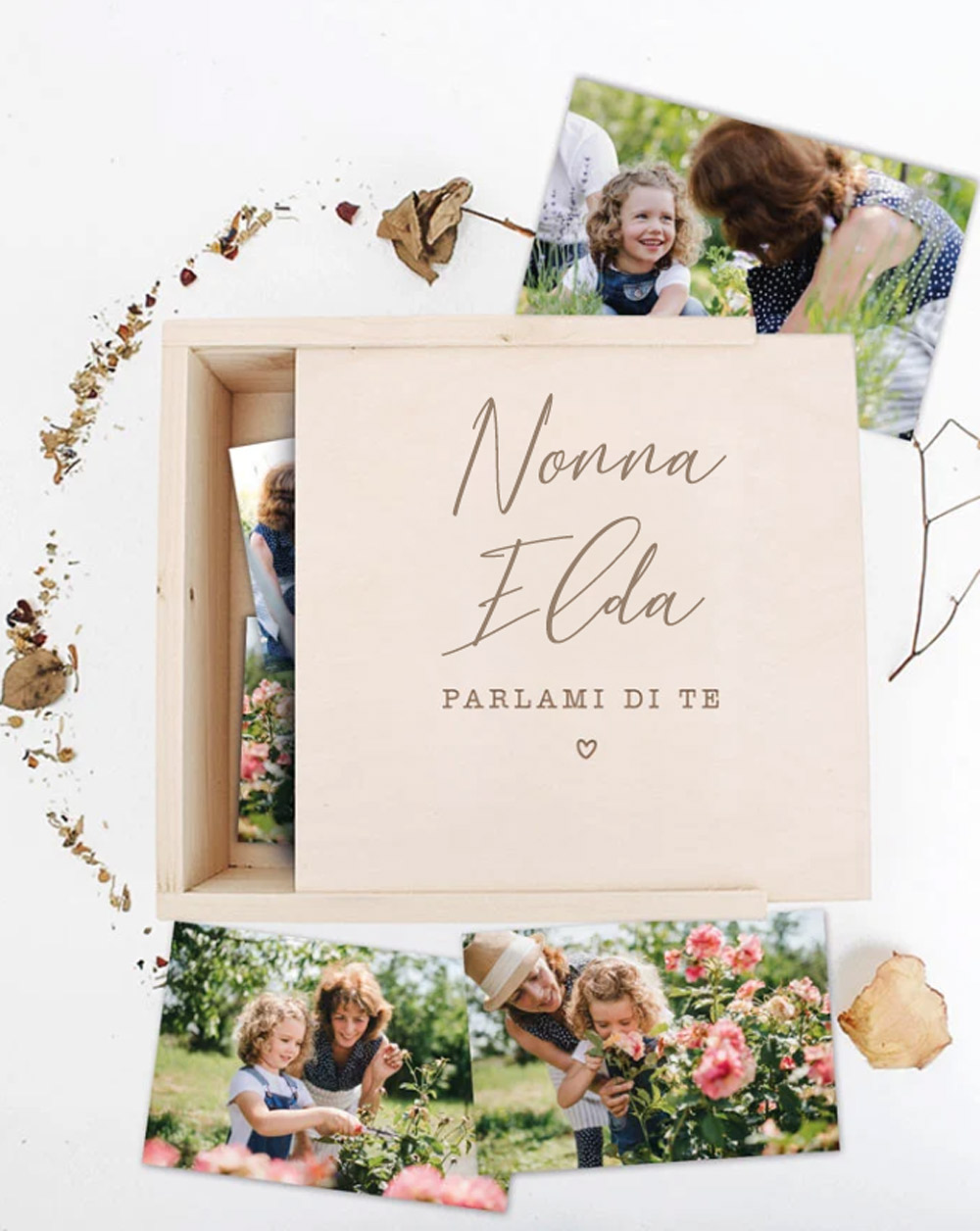 Dolcissima Scatola dei Ricordi o Memory Box personalizzabile con la scritta “Nonna Parlami di te”. Per la prossima Festa dei Nonni regala un’emozione alla tua nonna del cuore con questa scatola in legno inciso, che potrai riempire con le vostre foto, i libri di ricette e i tanti ricordi che vi legano. Siamo sicuri che alla nonna scenderà una lacrimuccia vedendola!