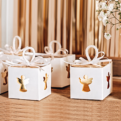 Set di 10 Scatoline con disegno dell’angelo bianco e oro in cartoncino, ideali per contenere confetti, piccoli oggetti e dolcetti. Perfette come bomboniera per il tuo matrimonio e per tutte le tue cerimonie importanti. Disponibile in varie colorazioni.