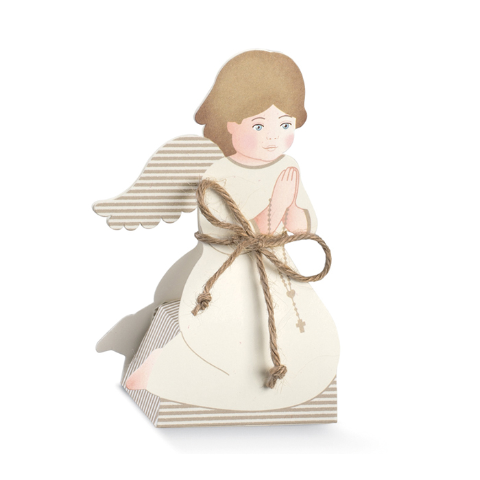 Bellissimo Set di 10 Scatoline a forma di Angioletto in ginocchio disponibile in color tortora. Perfette per contenere confetti, praline o dolcetti. Ideali come bomboniera per il battesimo, per la comunione e per tutte le tue cerimonie.