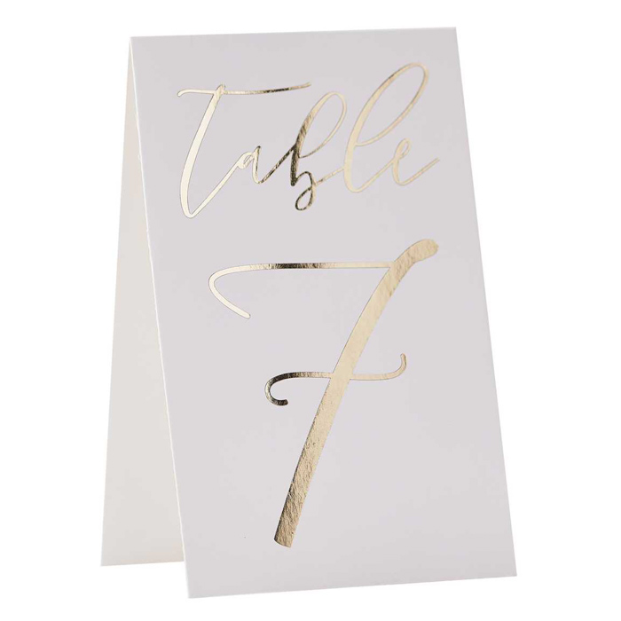 Consenti ai tuoi ospiti di essere indirizzati ai loro tavoli con questi bellissimi segnatavola con la scritta dorata su sfondo bianco. Un dettaglio perfetto per il giorno del tuo matrimonio e per rendere felici tutti i tuoi invitati. Questi fantastici numeri da tavolo hanno un design minimal perfetto per le tue nozze.