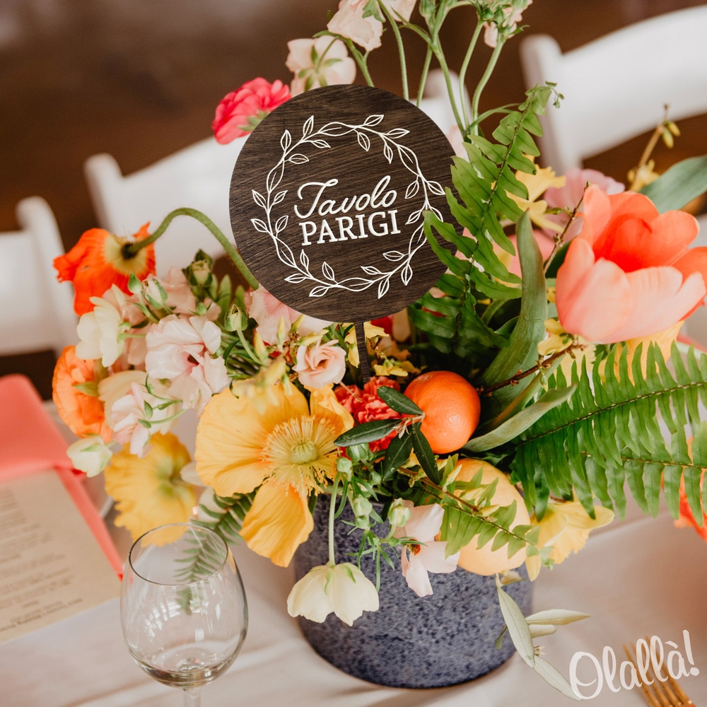 Semplice ed elegante segnatavolo tondo o a forma di cuore decorato da una bellissima incisione foliage, personalizzabile con l’incisione del nome o del numero che desideri per il tuo tavolo. Perfetto da abbinare alla venue della tua cerimonia, che sia vintage, glamour o country chic!