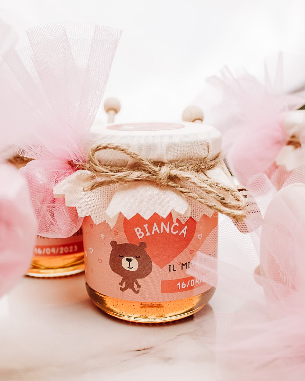 Dolcissimi vasetti di miele personalizzati con un tenero orsetto ed il nome del bambino. Il copri vasetto in tessuto è decorato con un simpatico cuore con la scritta che preferisci e adornato da un nastrino di spago. Personalizza con la tua frase e data speciale. Puoi scegliere di riceverle a casa da confezionare autonomamente o di riceverle già pronte e perfette per essere subito disposte sul tavolo del tuo evento.