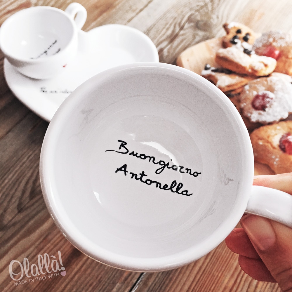Tazzine da caffè o tè/cappuccino in ceramica smaltate e dipinte a mano da un’esperta ceramista. Lettere e decori sono realizzati a pennello, non scritti con penne o pennarelli indelebili: questi decori sono destinati a durare per sempre, lavaggio dopo lavaggio anche in lavastoviglie. Il set comprende 2 tazzine da caffé o tè/cappuccino e 1 vassoietto oppure vassoio a cuore.