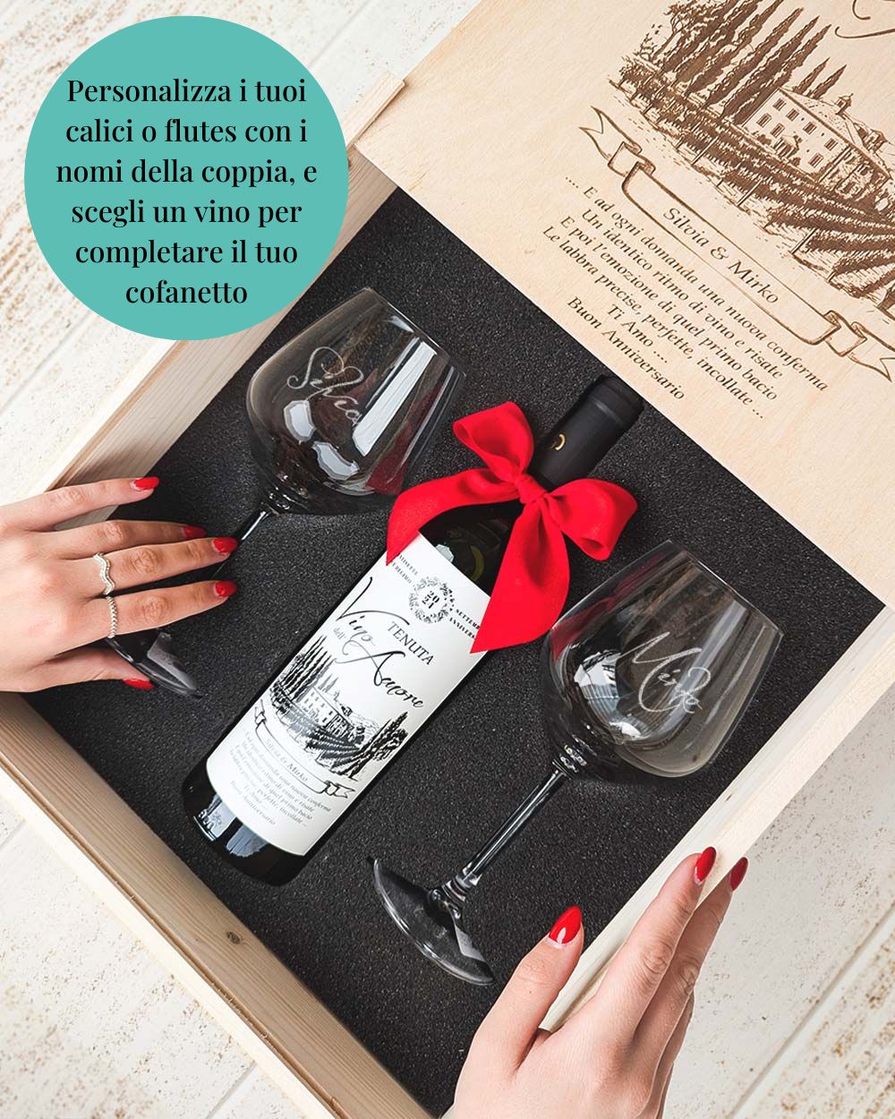 12 recensioni per Set Cofanetto in Legno “Tenuta Vino dell’Amore”, con Due Calici Flute Personalizzabili con Nome, Bottiglia con Etichetta Personalizzata, Coperchio Personalizzabile con Nomi, Data e Dedica – Idea Regalo per Anniversario