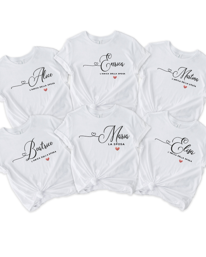 ATTENZIONE: Le scritte “La Sposa” e “L’amica della Sposa” sotto il nome rimangono standard. Le t-shirt sono personalizzabili solo con il nome.