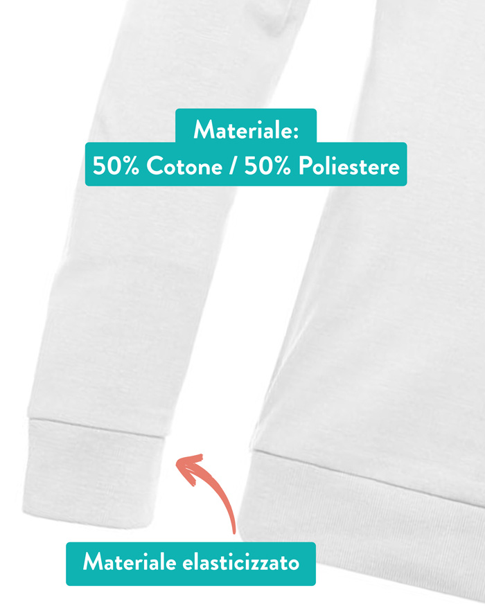 Le felpe sono realizzate in 50% cotone e 50% poliestere. Interno in pile. Cuciture doppie. Polsini e bordi a costine 1×1 con elastan.