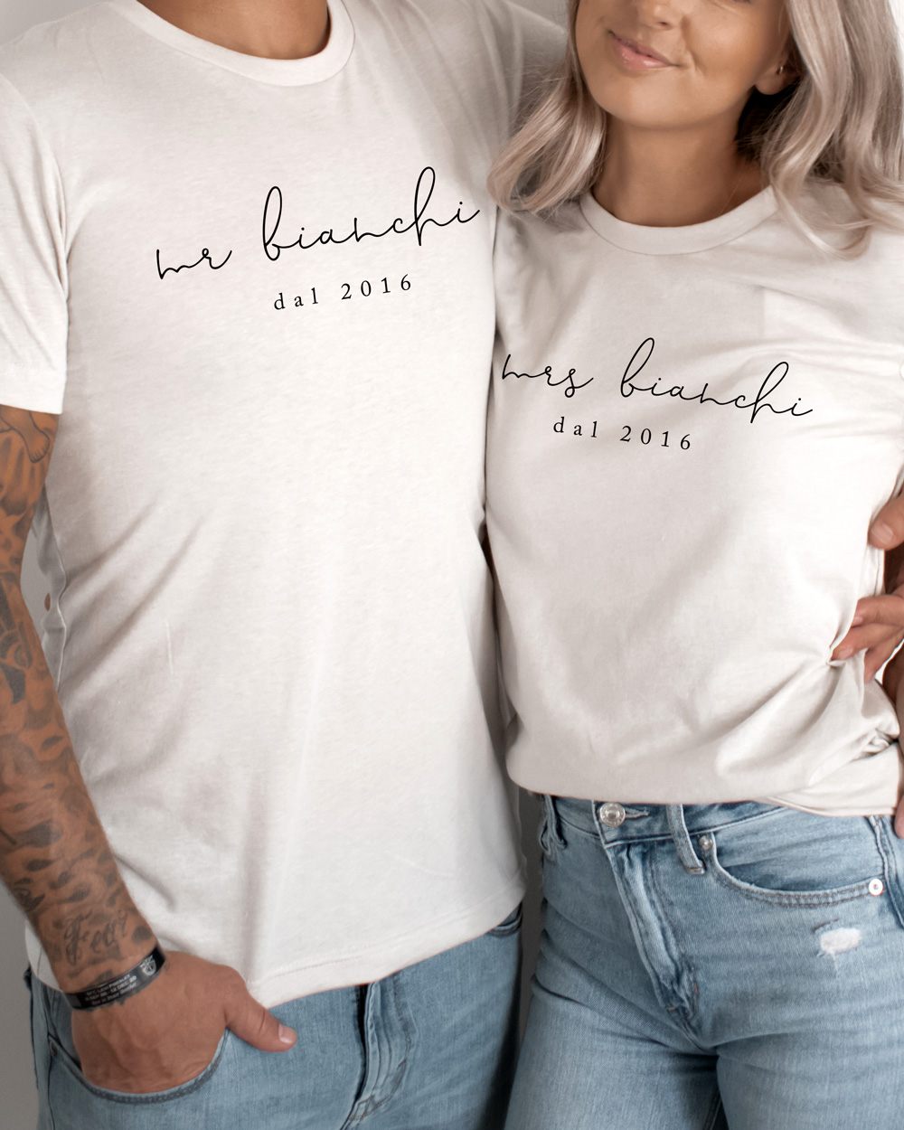 Set coordinato di t-shirt personalizzabili con il vostro nome e l’anno in cui vi siete fidanzati.