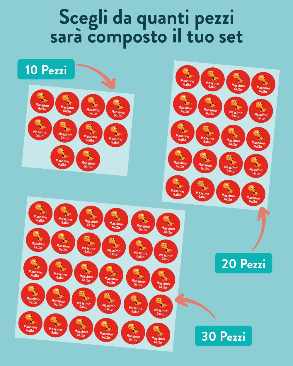 2. Quantità Flessibile: disponibili in set da 10, 20 o 30 etichette, ti permettiamo di scegliere la quantità perfetta in base alle tue necessità. Che tu abbia bisogno di poche etichette o di oltre un semplice set per tutta la cancelleria, abbiamo la soluzione giusta per te.