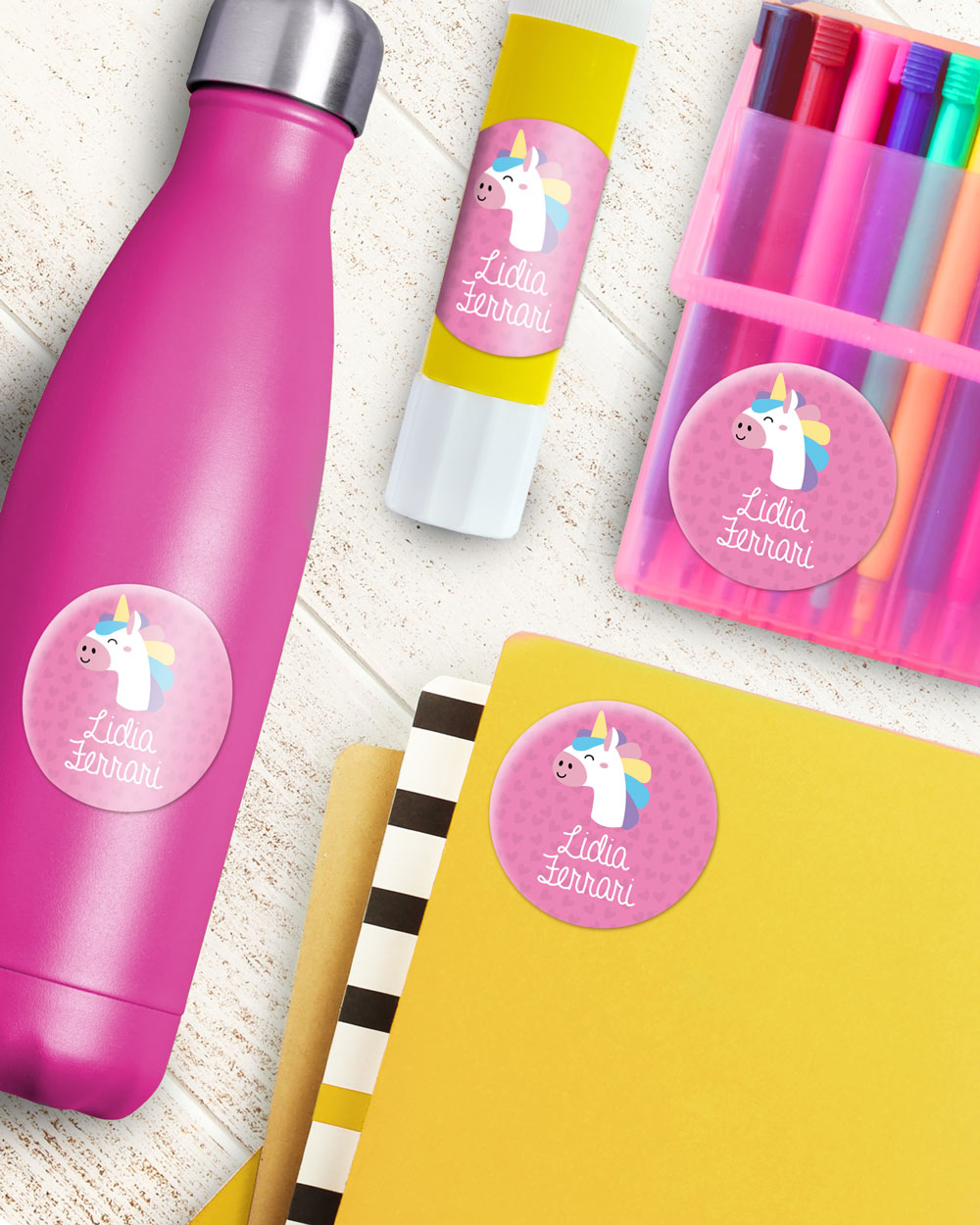 1. Colori Vivaci e Simboli Divertenti: i bambini adoreranno scegliere tra una vasta gamma di colori e simboli. Questo non solo facilita il riconoscimento dei propri oggetti, ma aggiunge anche un tocco di allegria al loro materiale scolastico.