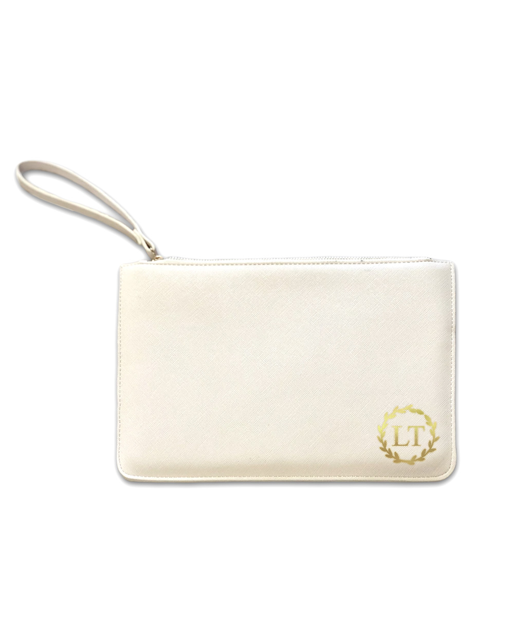 Set di 3 Pochette in Ecopelle Personalizzate con Iniziali Oro e Decorazione Alloro: dona qualcosa di veramente speciale alle invitate dell’addio al nubilato.