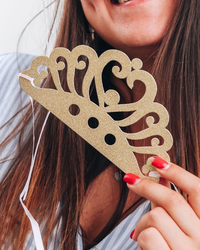 Ogni confezione contiene 4 cerchietti in color oro glitter con lo spago per agganciarli al capo.