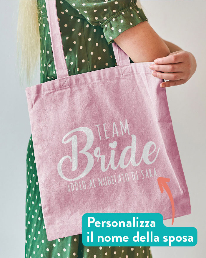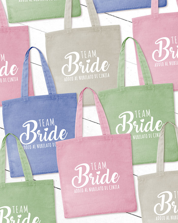 - Personalizzazione: ogni shopper è personalizzabile con la scritta “Team Bride addio al nubilato di” seguita dal nome della sposa. Un dettaglio che fa la differenza e rende ogni borsa unica e speciale, proprio come la festa che state per celebrare.