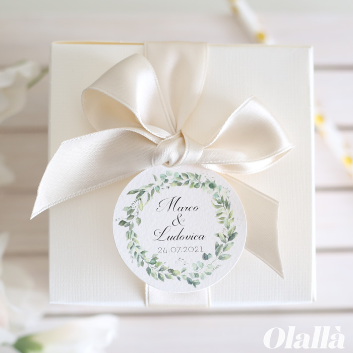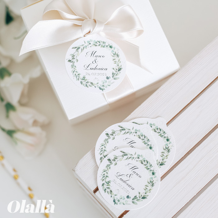 Tag elegantissimi con decoro a forma di ghirlanda nei toni del verde. Perfetti per corredare le vostre bomboniere di matrimonio, comunione, battesimo o cresima.