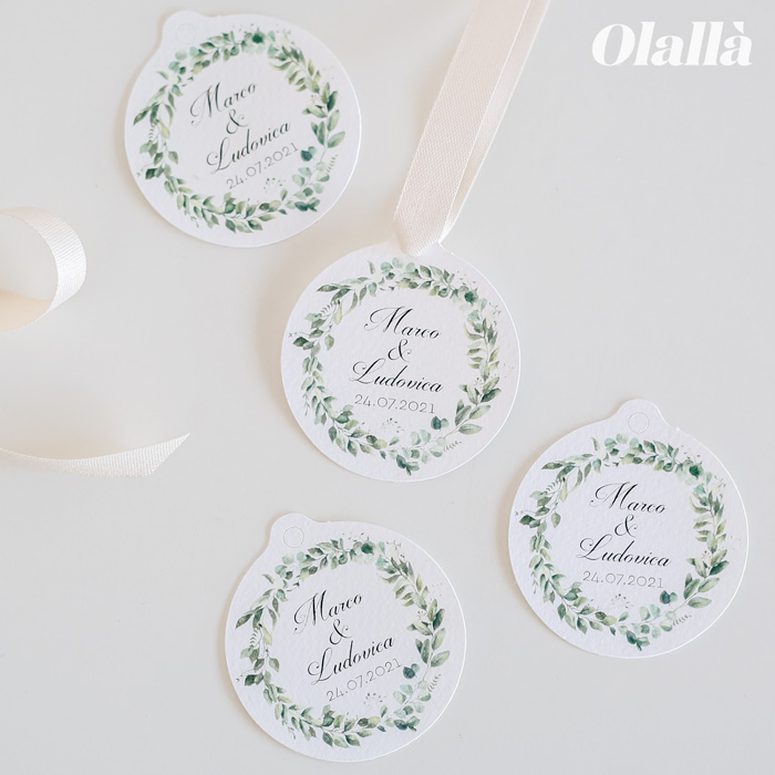 1 recensione per Tag Tondi per Bomboniere Personalizzati con Nomi, Data e Decoro Foliage Verde – Idea Decorazione Bomboniere per Matrimonio