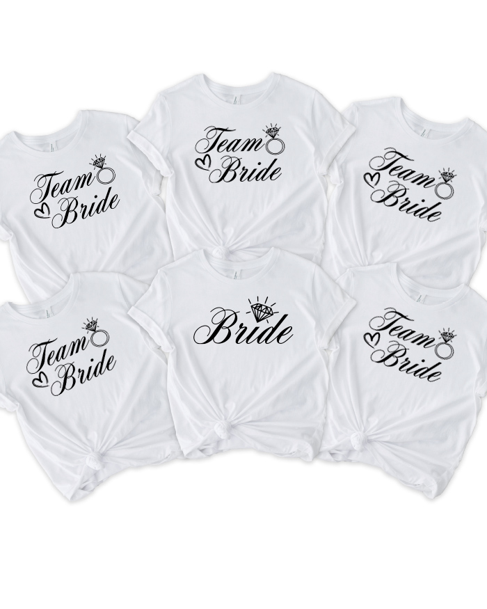 T-Shirt coordinate  “Bride” e “Team Bride” con in stile calligrafico artistico: un accessorio irrinunciabile per festeggiare l’Addio al Nubilato!